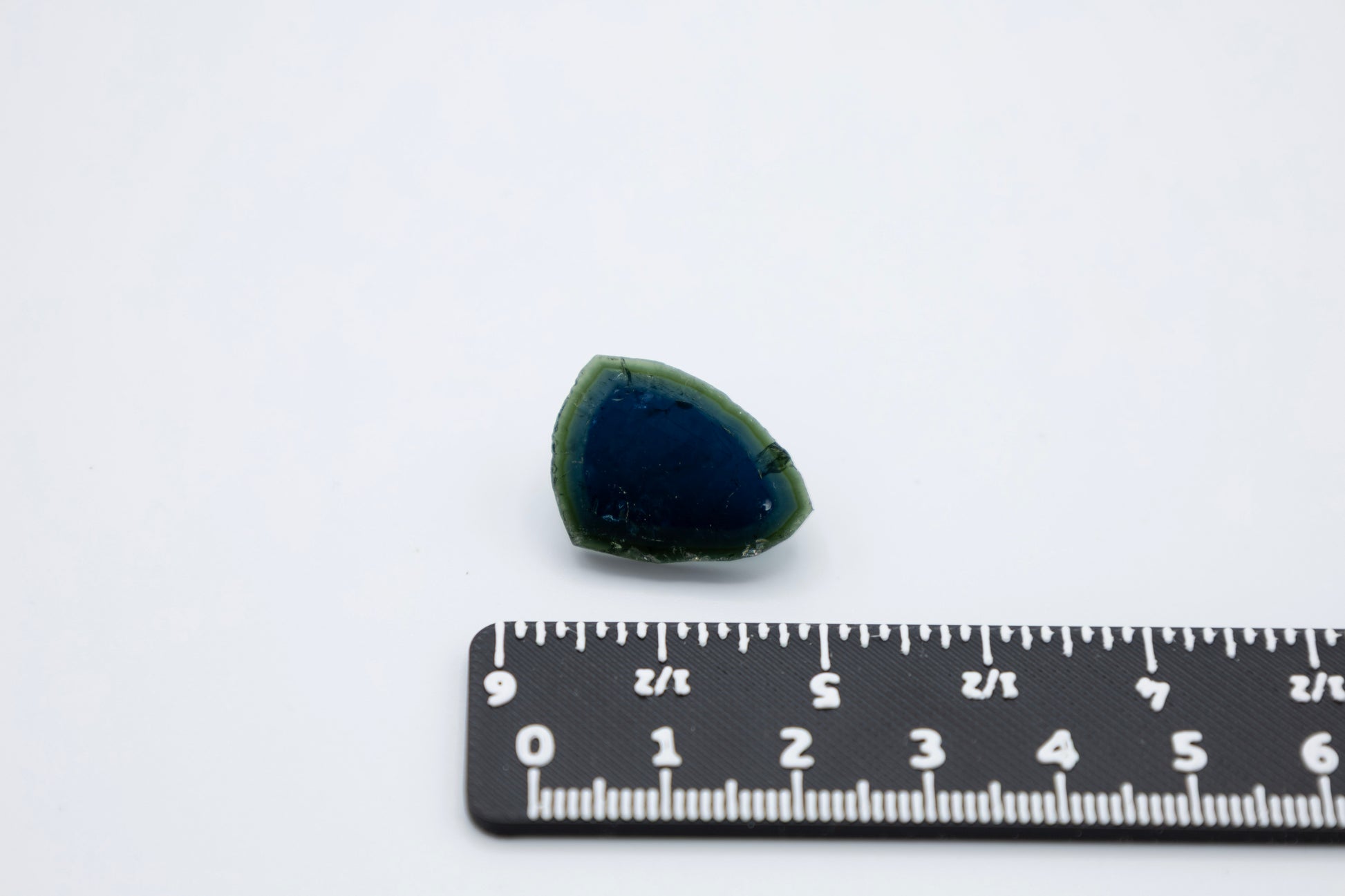 Dieser faszinierende blaue Turmalin besticht durch seine charakteristische Zweifarbigkeit: Ein grünes Band umrahmt das Äußere, während das Innere in intensivem Blau leuchtet. Das flache, handliche Format macht ihn ideal für Sammler und Mineralienliebhaber. Turmaline sind für ihre vielfältigen Farben und kristallinen Strukturen bekannt und gelten in der Mineralogie als besonders wertvoll. Ein authentisches Stück mit natürlicher Schönheit und geologischer Bedeutung.