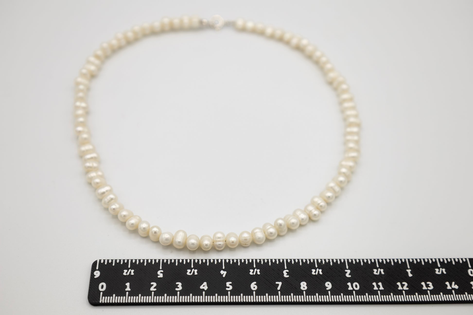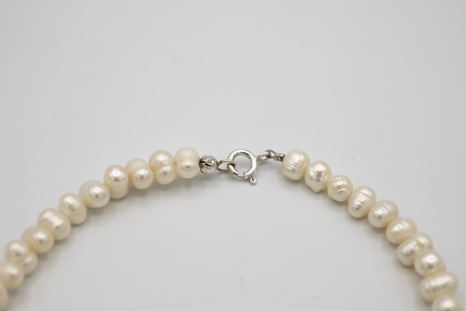 Hochwertige Perlenkette aus echten Süßwasser-Zuchtperlen in einem cremigen Weiß mit feinem, natürlichem Perlmuttschimmer. Jede Perle wird sorgfältig ausgewählt und überzeugt durch ihre charakteristische, natürliche Oberflächenstruktur, die den authentischen Ursprung der Zuchtperlen unterstreicht.